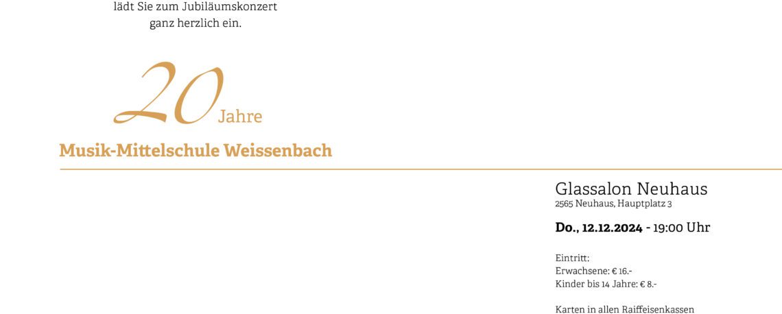 Am 12. Dezember feierten wir, unterstützt vom „All Generation Sinfonie Orchester“, 20 Jahre Musikmittelschule Weissenbach im Stadttheater Berndorf. Zu unseren …