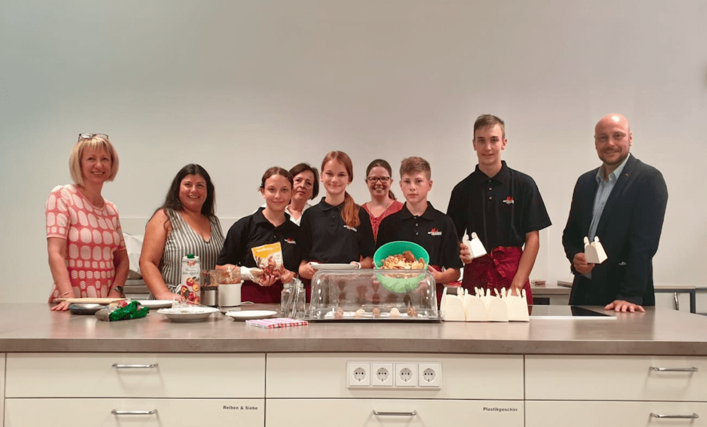 Tatsächlich waren unsere Schülerin Julia Stängl sowie die Schüler Anton Balber, Luca Neubauer und Simon Reiter, heuer die einzigen im ganzen Bezirk, welche als Junior Basic Company, unter der Schirmherrschaft der Wirtschaftskammerstelle Mödling, ihr unternehmerisches Talent unter Beweis stellten. Dies wurde in gebührendem festlichen Rahmen mit der Abschlusspräsentation und Urkundenübergabe in der Schulküche gefeiert. Hierzu kamen Frau SQM Monika Dornhofer, Bezirksstellen Leiterin Frau Mag. Andrea Lautermüller und Bezirksstellenobmann Herr Mst. Ing. Martin Fürndraht zu uns und wurden von der Schülerin und den Schülern bei einem Show-Cooking mit anschließender Verkostung von der herausragenden Produktqualität überzeugt.
