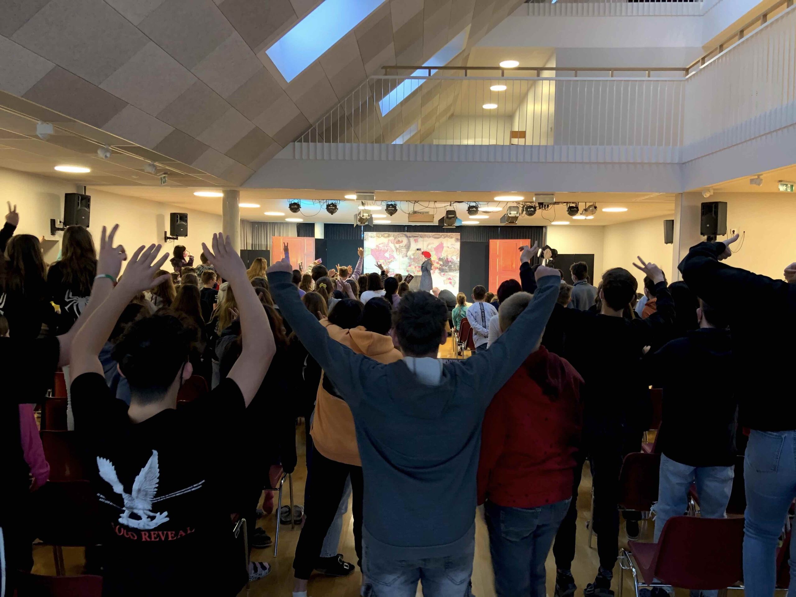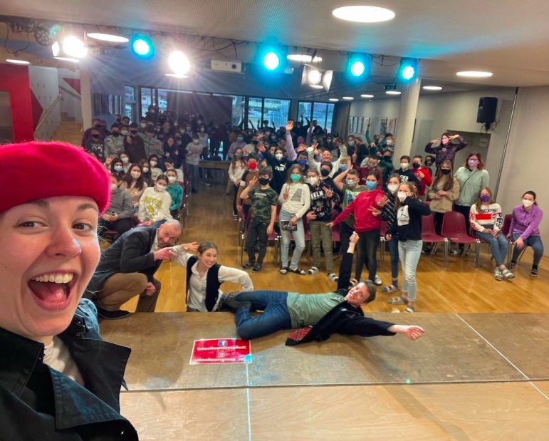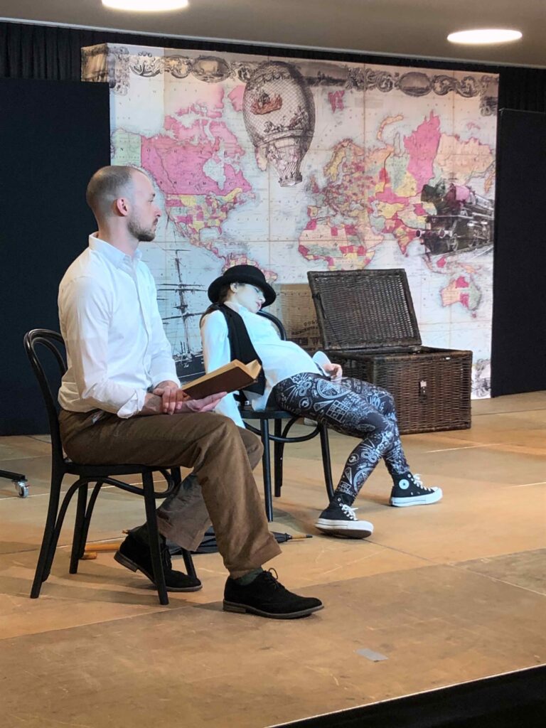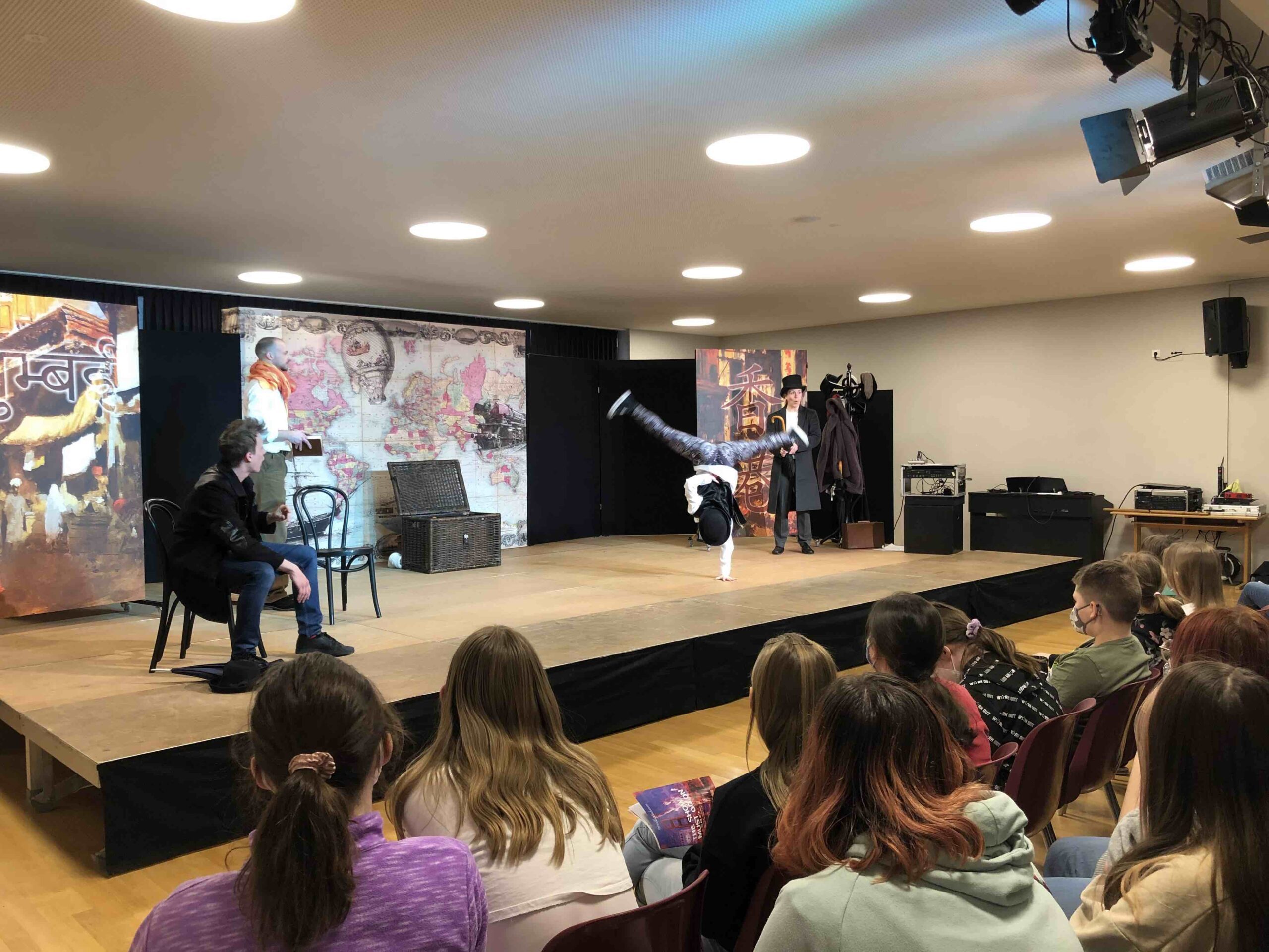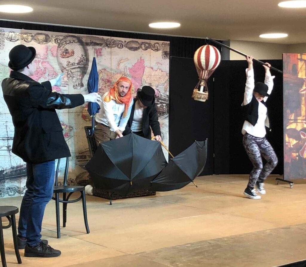 The Show Must Go On, heißt das neue Stück der „Vienna’s English Theatre – Schools Tour“. Frei nach Jules Vernes „In 80 Tagen um die Welt“ präsentierten uns die vier SchauspielerInnen des „Cast C“ ein abwechslungsreiches und spannendes Programm. Mit vollem Körpereinsatz und kreativen Einfällen wird die abenteuerliche Reise, in Stürmen auf hoher See, bei Schlangenbeschwörungen, auf dem Rücken von Elefanten, in vielerlei Zügen, im Zirkus und auch in einem Heißluftballon, dargestellt. Unsere SchülerInnen wurden das eine oder andere Mal sogar eingebunden und durften mitbestimmen was auf der Bühne als nächstes passieren sollte.