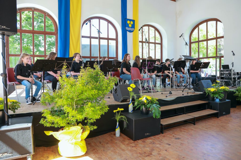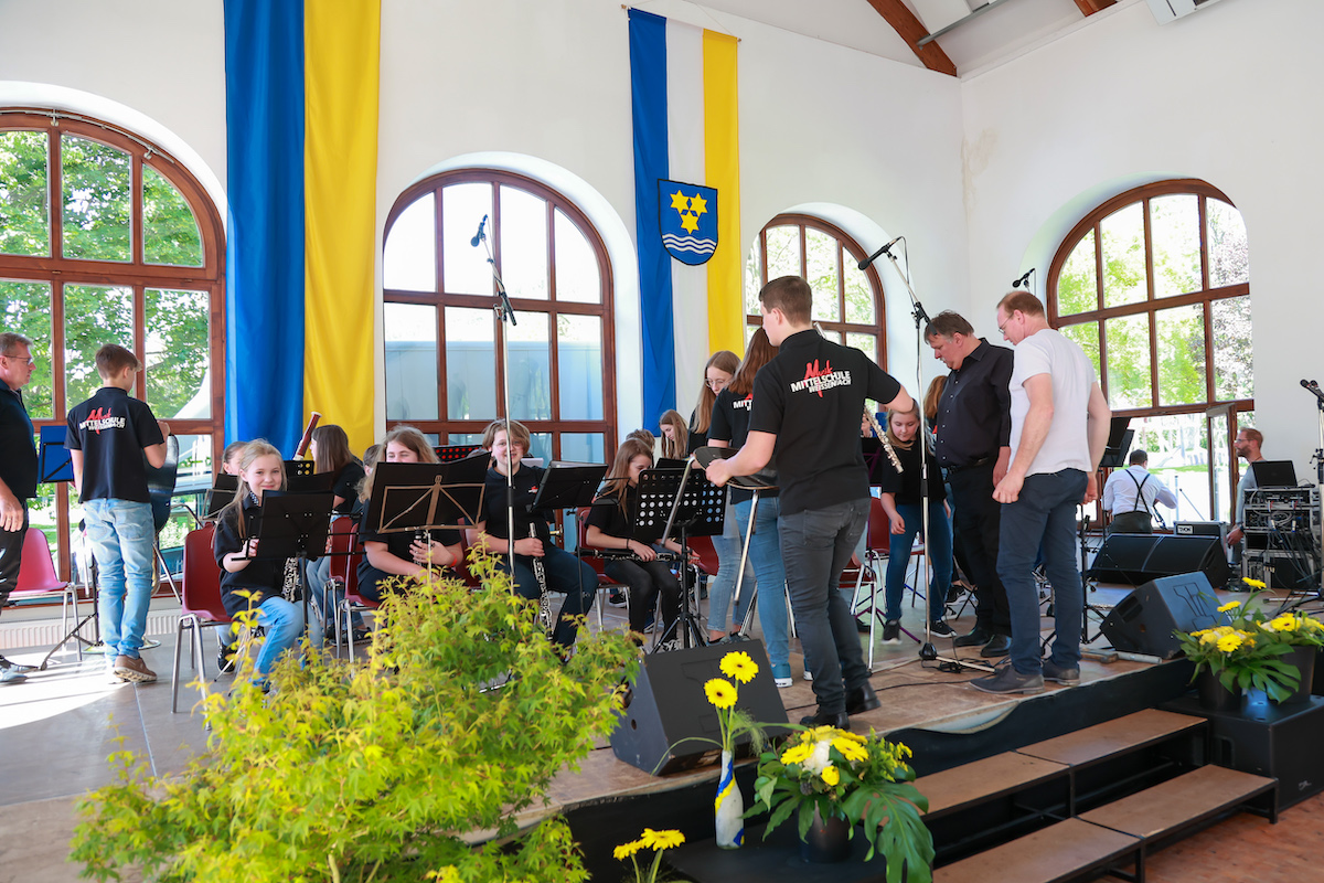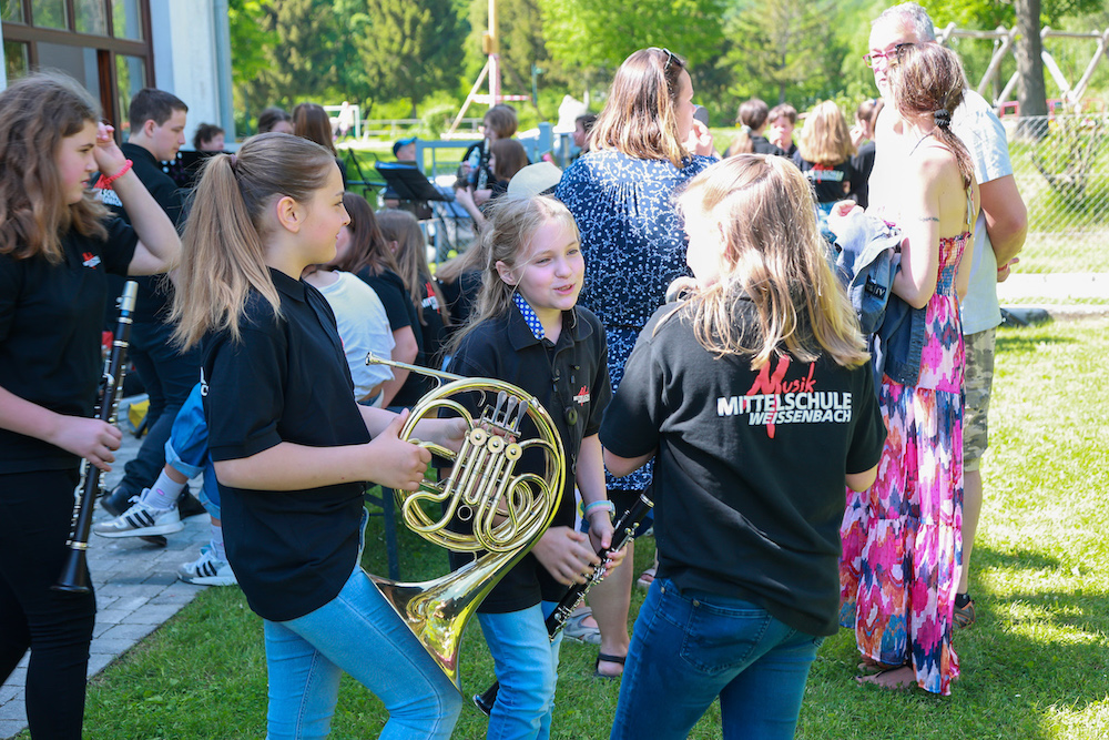 Anlässlich des „Festes für alle“ der Marktgemeinde Weissenbach trat erstmals die Blasmusik der Musikmittelschule Weissenbach in Erscheinung. 30 Schülerinnen und Schüler spielten die Stücke „Rehragout“, „Hans bleib da“ und die „Amboss-Polka“ sowie die moderne Nummer „Rock Point 5“. Beim Klassiker „Hans bleib da“ sang Bürgermeister Johann Miedl kräftig auf der Bühne mit, bei der Polka schlug Vizebürgermeister Josef Ungerböck den Amboss und war danach rechtschaffen müde, weil die Kinder das Spieltempo immer mehr steigerten – so wie sich das bei diesem Musikstück gehört. Dazwischen trat ein Flüchtlingskind aus der Ukraine mit einem Volksmusikinstrument aus ihrer Heimat, einer Bandura, auf und verzückte dazu das Publikum auch noch mit ihrer glockenhellen Stimme. Der Nachmittag war somit berührend und humorvoll zugleich.