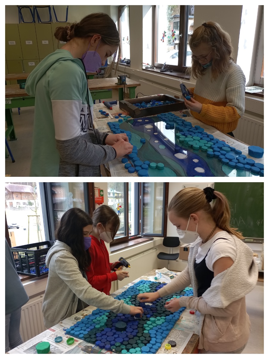 Die SchülerInnen verschiedener Klassen hatten im vorigen Schuljahr im Rahmen des Werkunterrichtes, unter der Anleitung von Frau Fachlehrerin Lang, die Stöpsel geschliffen, bemalt und mit Heißklebepistolen auf Plexiglasplatten geklebt. Eines der Bilder ziert jetzt die Aula unseres Schulgebäudes.
