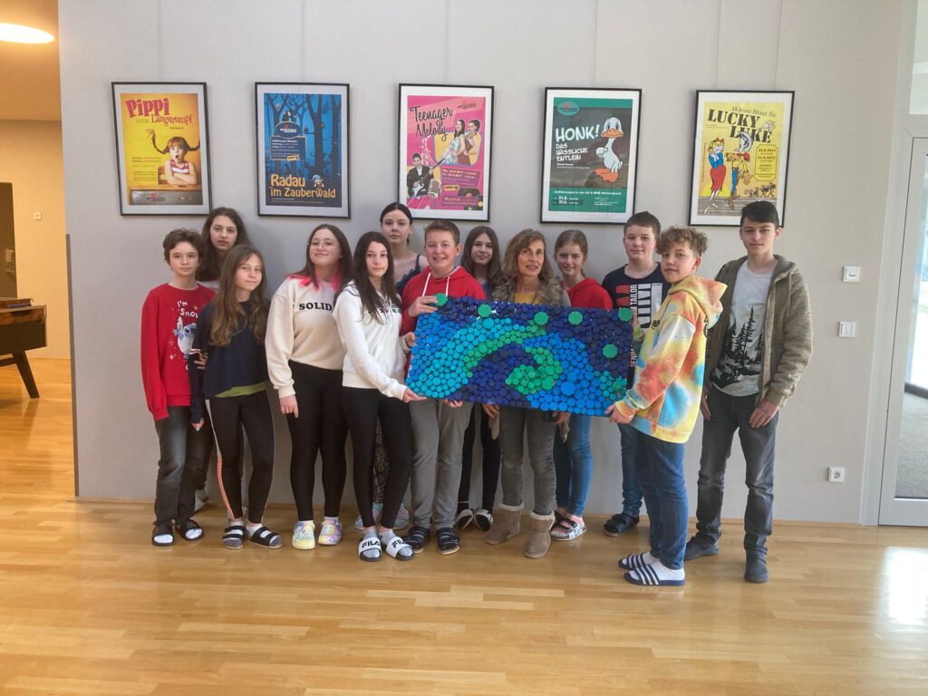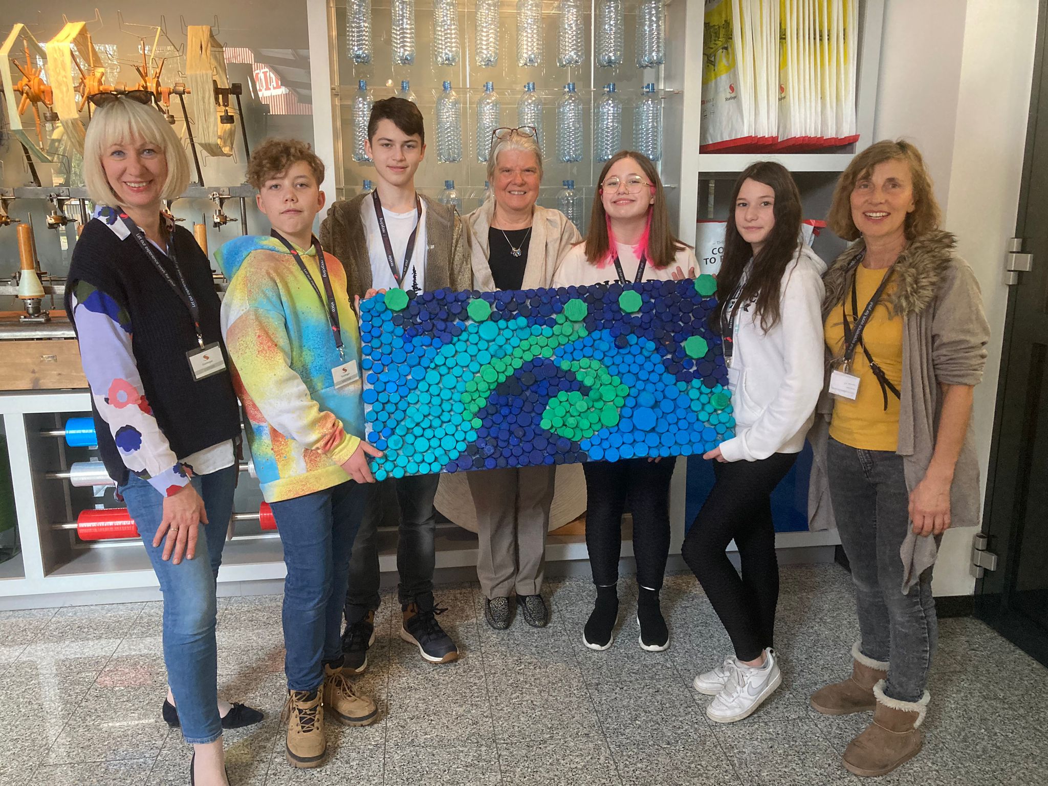 Wir überreichten heute eines der Recycling-Bilder, die wir im Werkunterricht aus Stöpseln von Plastikflaschen angefertigt hatten, an die Firma Starlinger, welche Recyclinganlagen für Kunststoffe und Produktionsanlagen für Kunststoffverpackungen herstellt.