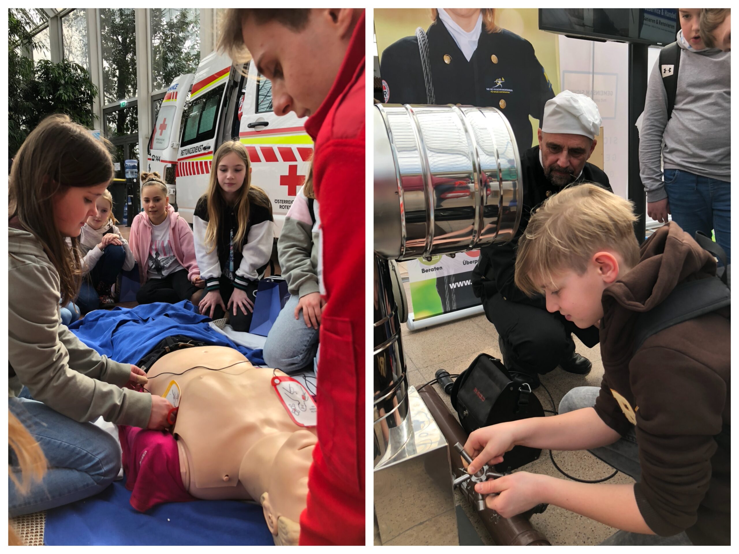 Unsere Kinder der ersten Klassen durften hier in die Berufswelt reinschnuppern und ihr handwerkliches Geschick mit Materialien, Geräten und Maschinen testen. Mit dabei waren z.B. die ÖBB und Blauchlichtorganisationen wie die Polizei und die Rettung.
