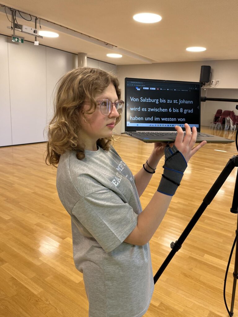 Die Schülerinnen und Schüler durften sich die Region, über die sie berichten wollten, selbst aussuchen und waren dabei nicht nur auf Österreich begrenzt. So gab es auch Wetterberichte aus Mexiko, Kroatien und Ungarn. Die Gruppen mussten sich ihre Arbeit selbst aufteilen und waren gefordert, das Wetter aus den jeweiligen Regionen zu recherchieren, dazu einen passenden Wetterbericht zu verfassen, diesen in einen Teleprompter einzuspeisen, um dann vor laufender Kamera den Bericht zu präsentieren.