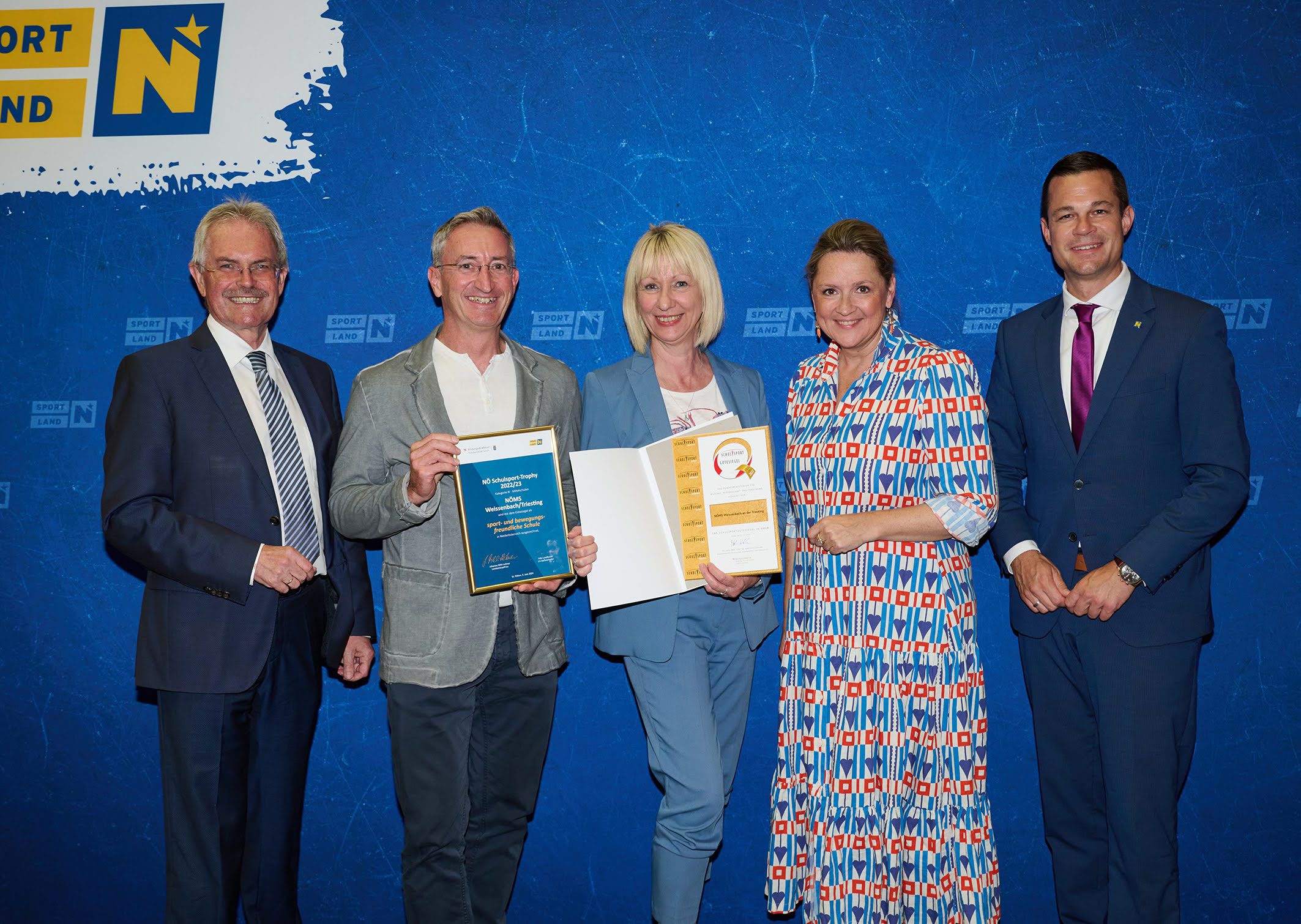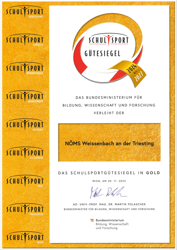 Im Landtagssaal konnten die Schulleiterin und Sportlehrer Andreas Ascher in Anwesenheit von Landtagspräsidenten Karl Wilfing, , Landesrätin Barbara Rosenkranz und Bildungsdirektor Karl Fritthum das Sportgütesiegel in GOLD entgegennehmen.