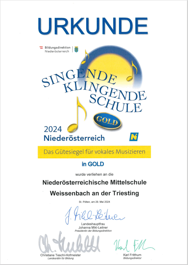 In St. Pölten wurde das musikalische Gütesiegel „Singende Klingende Schule“ in GOLD an Frau Direktorin Andrea Sattler und den Musikkoordinator Andreas Bartl feierlich überreicht.