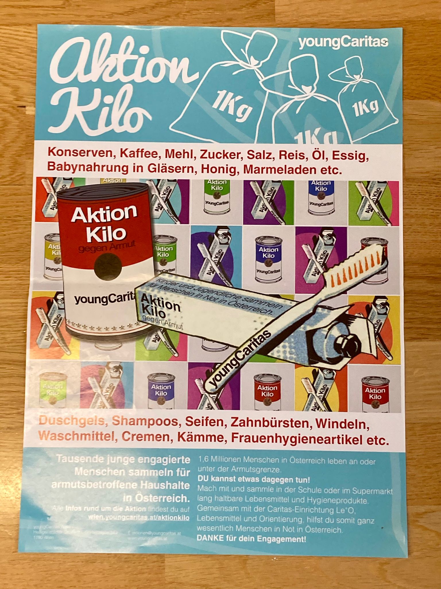 Bei der Aktion „Kilo gegen Armut“ der youngCaritas Wien sammeln Schulklassen lang haltbare Grundnahrungsmittel und Hygieneartikel für armutsbetroffene Menschen in Österreich. Damit helfen Kinder und Jugendliche ganz wesentlich Menschen in Not in Österreich.