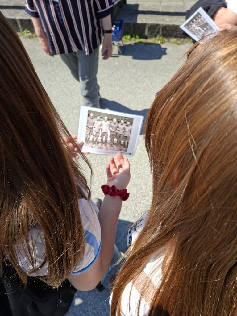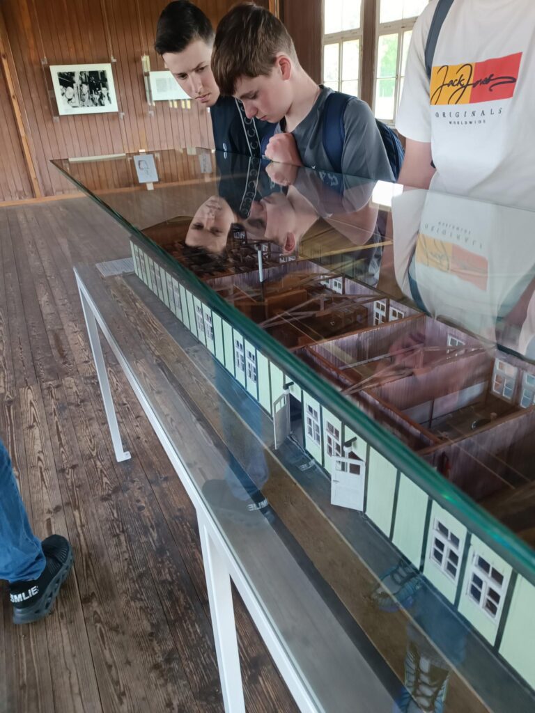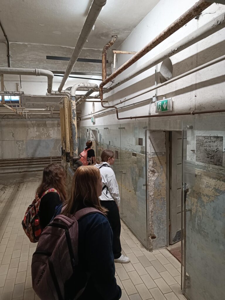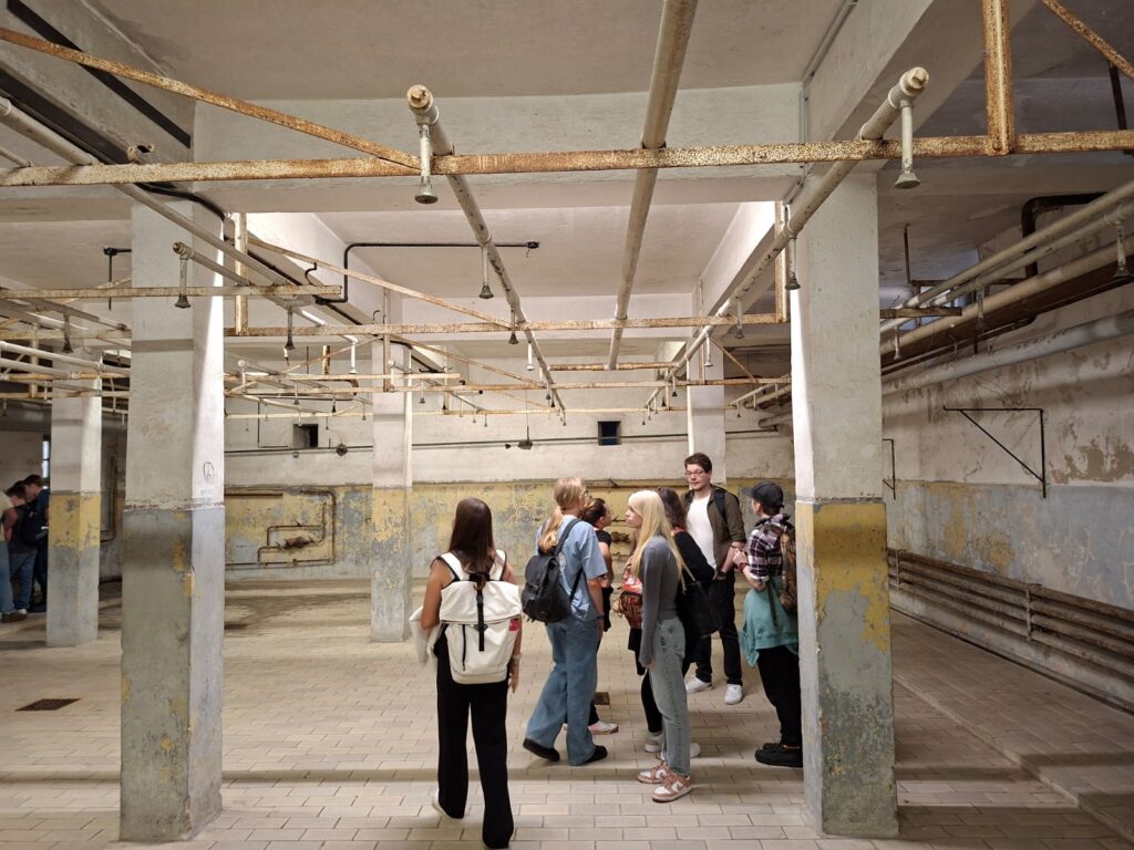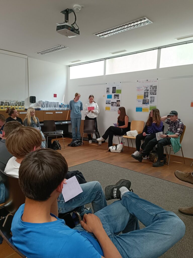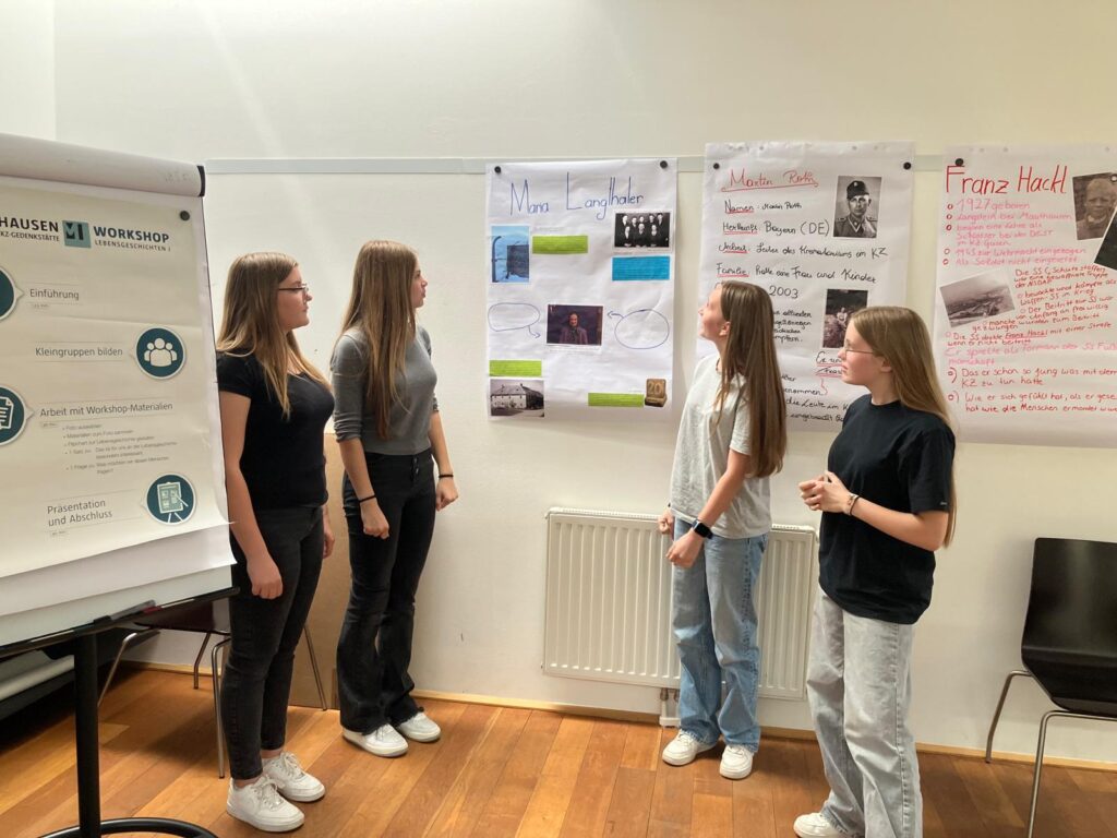 Die Klassen wurden in drei Gruppen unterteilt und haben einen Rundgang durchs Gelände erhalten. Im Anschluss gab es einen Workshop zum Thema „Lebensgeschichten“, wo die Schülerinnen und Schüler die Geschichten von Häftlingen, aber auch von dort tätig gewesenen Nationalsozialisten kennenlernen konnten. Diese Geschichten haben sie dann in Form von Postern ihren Mitschülerinnen und -schülern präsentieren können.