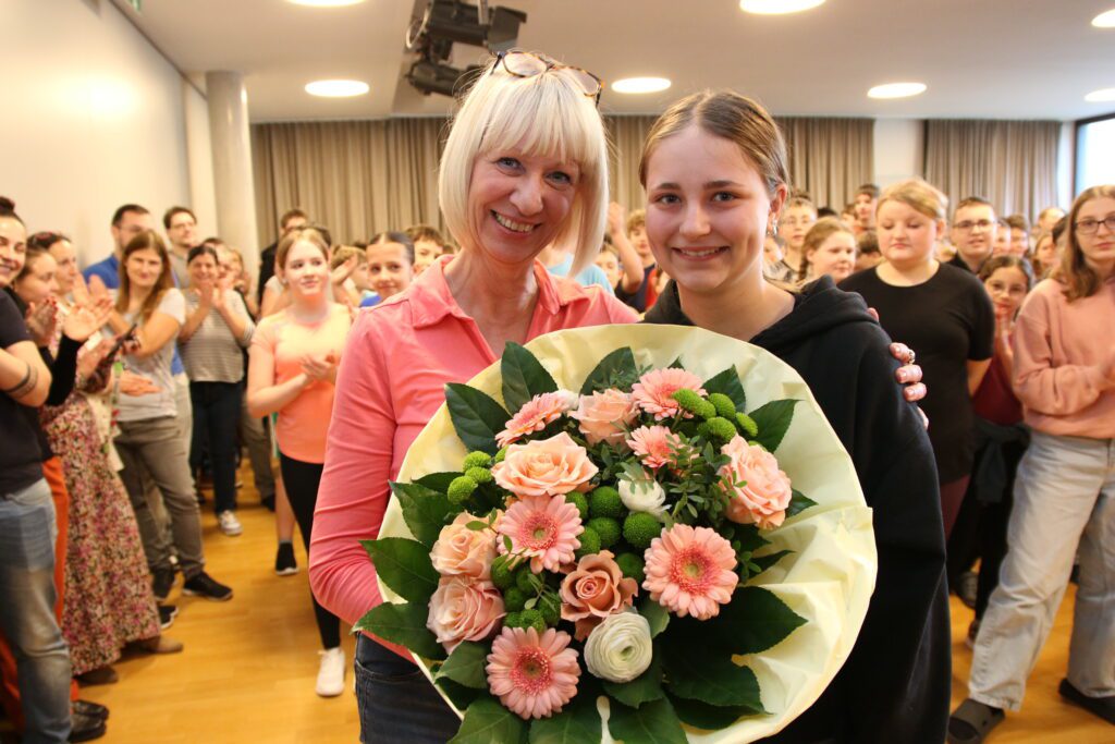 Unsere Direktorin, Frau OSR Andrea Sattler, staunte nicht schlecht, als sie vor ein paar Tagen völlig überraschend in den Tanzsaal gerufen wurde. Da warteten alle Schülerinnen und Schüler, das Schulwarte-Team und das komplette Lehrerkollegium, um ihrer Schulleiterin mit einem „Happy birthday“ zu ihrem 60. Geburtstag zu gratulieren. Die Schulsprecherin Annalina Raith überreichte einen Blumenstrauß, aber auch die Bürgermeister Gerhard Leutgeb und Josef Balber sowie Vizebürgermeister Josef Ungerböck gratulierten und sprachen die besten Glückwünsche aus. Natürlich fehlte auch der Schulobmann und Bürgermeister a.D. Johann Miedl nicht.