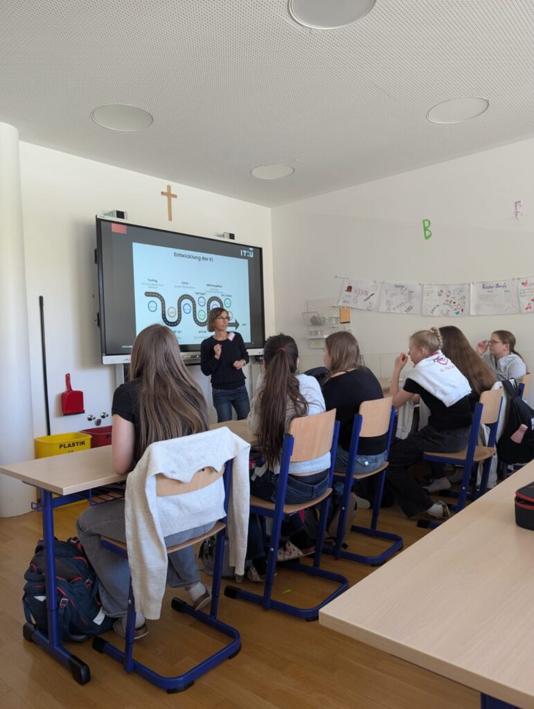 Im KI-Workshop setzten sich die Schülerinnen und Schüler mit den Grundlagen der Künstlichen Intelligenz auseinander und lernten, wie KI funktioniert sowie welche Möglichkeiten und Grenzen sie hat. Zudem beschäftigten sie sich mit den Auswirkungen von KI auf die Gesellschaft und reflektierten, wie KI ihren eigenen Alltag beeinflusst. Ein weiterer Schwerpunkt lag auf dem Umgang mit persönlichen Daten und der Frage, was mit diesen bei der Nutzung von KI geschieht.