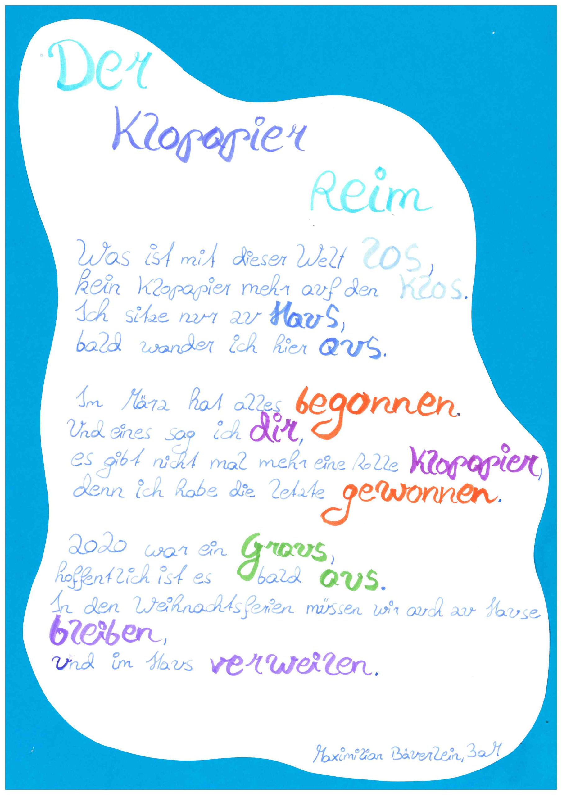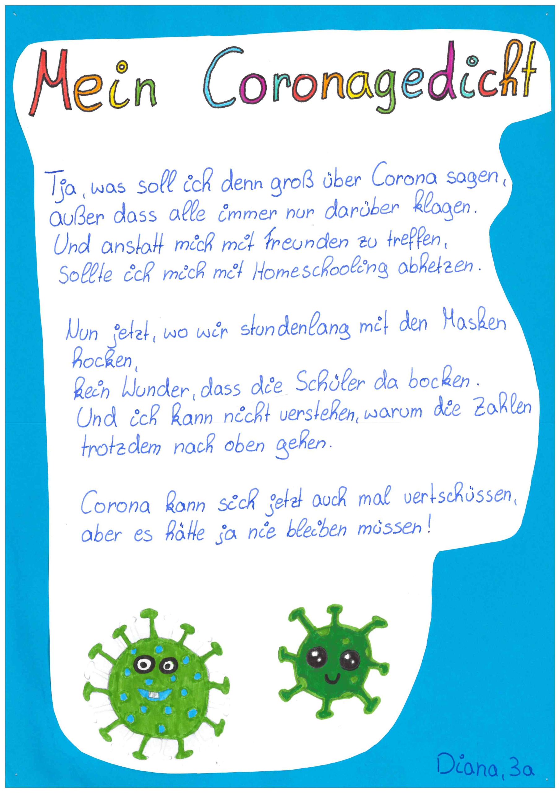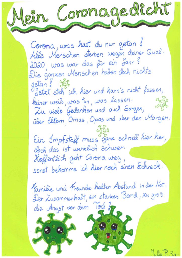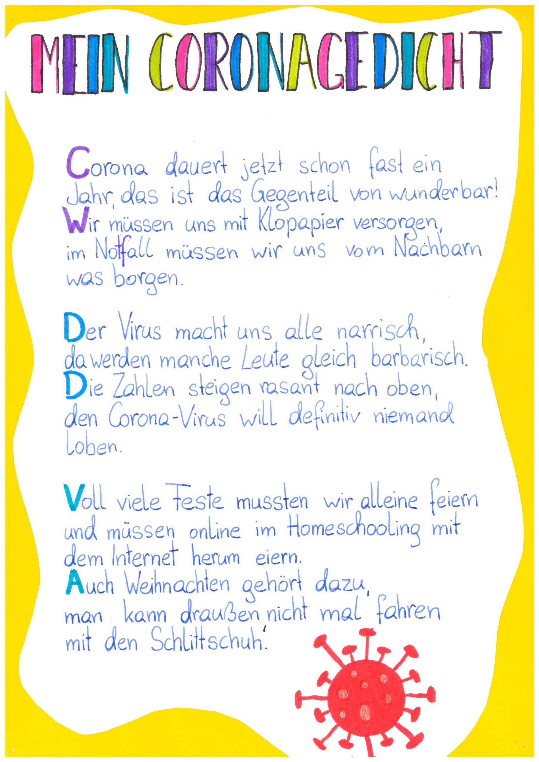 Coronagedichte der 3a 16 Dez.,2020 admin Die 3a verfasste im Deutschunterricht mit Frau FL Lisa Kraus zur momentanen Coronapandemie.